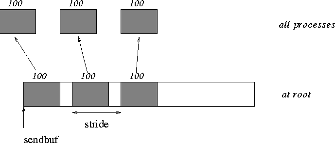 The reverse of Example Examples using MPI_GATHER, MPI_GATHERV . Scatter sets of 100 ints from the root to each process in the group. See figure 8 .