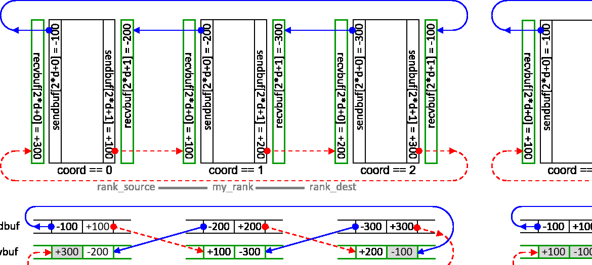 The figure may apply to any (or multiple) directions in the Cartesian topology. The grey buffers are required in all cases but are only accessed if during creation of the communicator, periods[d] was defined as nonzero (in C) or .TRUE. (in Fortran).
