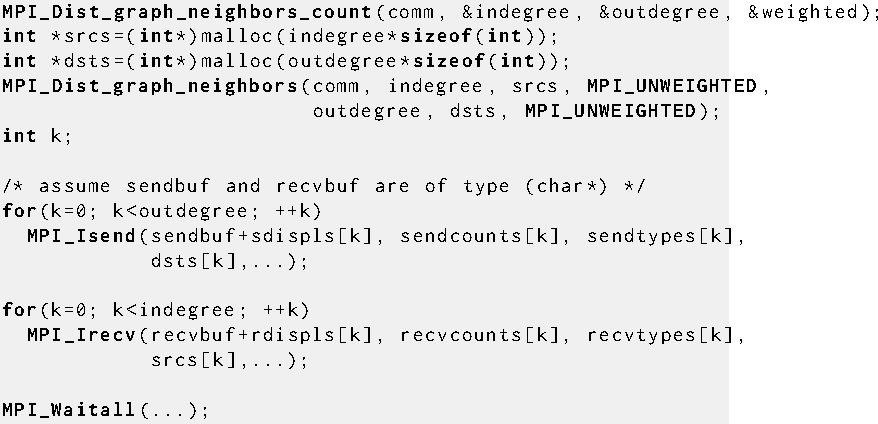 The MPI_NEIGHBOR_ALLTOALLV procedure supports Cartesian communicators, graph communicators, and distributed graph communicators as described in Section Neighborhood Collective Communication on Virtual Topologies. If comm is a distributed graph communicator, the outcome is as if each MPI process executed sends to each of its outgoing neighbors and receives from each of its incoming neighbors: