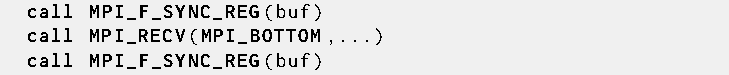 The compiler may be prevented from moving a reference to a buffer across a call to an MPI subroutine by surrounding the call by calls to an external subroutine with the buffer as an actual argument. The MPI library provides the MPI_F_SYNC_REG routine for this purpose; see Section Additional Support for Fortran Register-Memory-Synchronization.